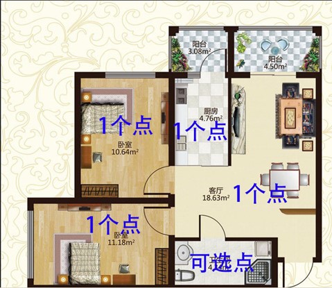 各個(gè)房間面積小于50㎡,各設(shè)一個(gè)點(diǎn);房間面積在50-100㎡,需設(shè)二個(gè)點(diǎn)